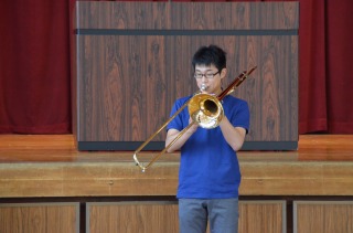 【朝礼の話(6月17日)】.pdf 今日は浮貝先生のお話でした。浮貝先生は、「1年生を迎える会」の入退場の曲でピアノ演奏を披露しましたが、「もう一つ別の楽器が演奏できます」と、トロンボーンを出してきました。ピアノは小学校に入る前から習いましたが、トロンボーンは高校生から始め、オーケストラの活動を通していろいろな人と出会って、今の自分があること。みんなも自分の好きなことや得意なことを、見つけて伸ばしてほしいと伝えました。最後にトロンボーンで、アラジンの主題歌「ホール・ニュー・ワールド」を演奏し、体育館は大きな拍手が響きました。