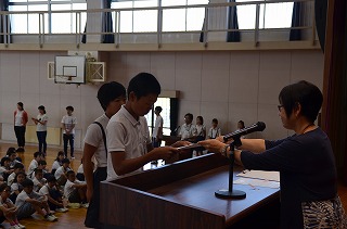 はじめに、愛西市小学校陸上競技会の表彰を行いました。校長先生から、「表彰された人もされなかった人も、お手伝いで参加してくれた人も、暑い中本当によく頑張りました。自分の力を十分に出せなかった人もいると思いますが、よい経験としてこれからの学校生活に生かしてください」というお話がありました。