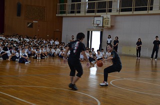 その後大好きなことに一つであるバスケットをする様子を、同じ学年の吉田先生を相手に、体育館の後方で実際に見せてくれました。シュートを外すと「はあ」というため息が漏れ、決めた時には大きな拍手が起こりました。若さのあふれたプレーでした。