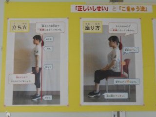 その一角に新しく、姿勢がチェックでき、体幹を鍛える呼吸法などについて書かれた掲示物が貼られています。「正しい姿勢」では、立ち方と座り方について説明しています。モデルは1年2組の浅野先生です。その隣には、正しい呼吸法について、イラストで描かれています。