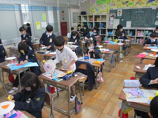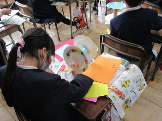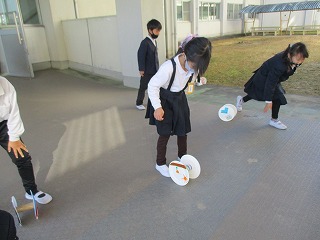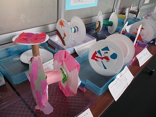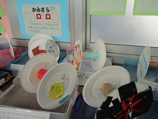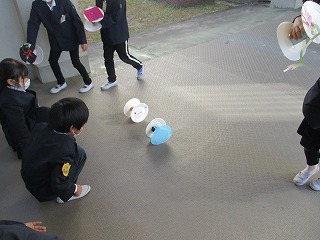 1年生は、図画工作科で、紙皿とトイレットペーパーをつなぎ合わせて、転がるおもちゃを作りました。渡り廊下の坂を利用して転がしてみると、コロコロとどの子の作品もよく転がりました。工夫して付けた飾りが、回ってとてもきれいに見えていました。