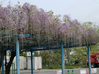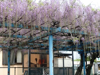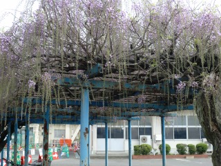 草平小学校の南門のところにある藤棚が、きれいに彩られ始めました。その昔は、体育館の方にあった藤棚でしたが、体育館を建てるときに今の場所に移植したそうです。