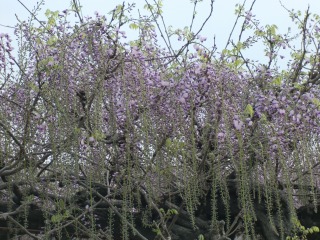 最近は、少し木自体の老朽化により、花をきれいに咲かせる年とそうでない年とが出てくるようになっていました。昨年の花は「いま一つ」だったようです。(それでも、初めて見る人にとっては、とても立派に見えましたが)今年は枝ぶりもとても良い感じです。(今年の花の方が昨年よりも立派だというのは、素人でもわかります)藤の花の蜜を求めて、丸っこい熊蜂が飛び始めました。