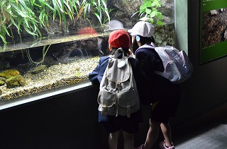 朝は雨がぱらつきましたが、汗ばむような陽気のなかで楽しく過ごすことができました。長良川源流~河口までの自然環境を再現した水槽の中にいる生き物や、世界の淡水に生きる生き物たちを見学しました。実物は息をのむ迫力で、皆圧倒されていました。