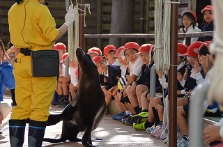 マリンちゃん・・アシカの名前です。マリンちゃんのパフォーマンスに皆大感激!目の前を歩いたり、輪投げをしたり、ボールを投げたり・・・楽しい時間はあっという間に過ぎてしまいます。