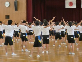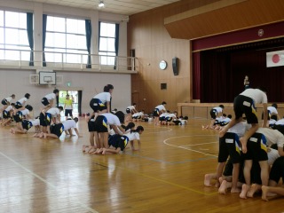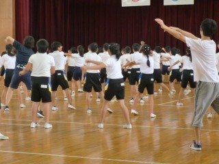 1・2年生が下校するころ、体育館では5・6年生が音楽に乗って、演技の練習を行っていました。今日はダンス以外に、演技の途中に入れる組み立て体操の練習もありました。4年間「どまつり」で鍛えた神野先生考案のダンスは、パフォーマンスが高く、難しい動きも多いのですが、さすがに子どもたちは若い!ほかの先生方が「?」と、動きが止まってしまう場面でも、一生懸命ステージの神野先生と小澤先生の動きに必死についていきます。月曜日に見たものとは、比べものにならないくらいに上手になっていました。