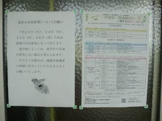 また、各教室の出入り口には、夏休みの通学団プールに関するお願いと、お子さんの発達に少し不安のある保護者のための催しなどのお知らせもしています。