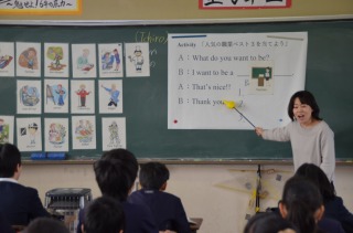 単元はUnit8 What do you want to be?「将来の夢を尋ねたり答えたりしよう」でした。外国語を使って将来就きたい職業について、理由を添えながら話し合ったり、ゲームで職業の言い方や将来の夢についての基本的な表現になれさせたりする活動をします。そして将来の夢やしたいこと、その理由などを考える中で、働くことの喜びや目的にもふれ、キャリア教育の一環としても活用するという内容です。