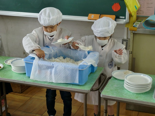 1年生では、昨日から給食が始まりました。初めての小学校での給食当番。特にご飯の配膳では、少し固まったご飯をほぐしながら、四苦八苦していました。