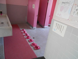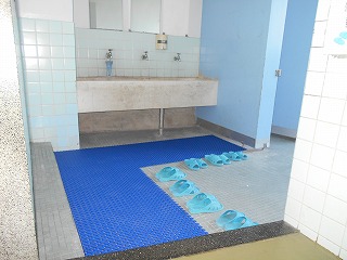 そのすのこを撤去し、業者さんに水はけができるマットに敷き替えてもらいました。L字型の形状にも、水道の配管にもぴったりと収まるようカットしてもらい、簡単に動くこともなくなりました。男子トイレはブルーを、女子トイレはピンクのマットを敷いてもらいました。幅も広くて、トイレに出入りする子と手洗いする子が余裕をもってすれ違えそうです。