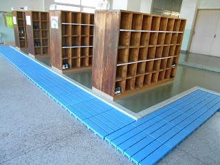 撤去したプラスチックのすのこは、1・4年生の使用する東昇降口に設置し、靴の履き替えの場所にしました。特に1年生は、靴の履き替えが楽になるでしょう。