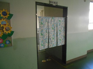 7月には、1年生の男子トイレが廊下から見えてしまうので、突っ張り棒を使用した暖簾を設置しました。