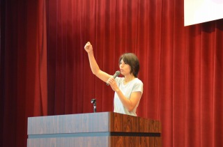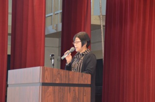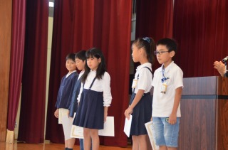 はじめに、ライオンズクラブ主催の敬老キャンペーン「おじいちゃん、おばあちゃんに手紙を書こう」で優秀な成績を収めた4年生の表彰がありました。みんなからの拍手に、舞台の上ではにかんでいる姿が印象的でした。