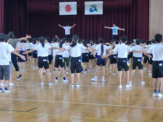 同じ頃、体育館からはリズミカルな音楽が流れてきていました。中を覗くと、5・6年生が、高学年の表現のダンスの練習をしていました。ステージでは、神野先生が後ろ向きに、小澤先生が正面を向いて、お手本で踊っています。なかなか激しいダンスで、子どもたちは汗だくになって踊っていました。今は先生の動きに少し遅れて必死に踊っていますが、これから練習を重ねて、本番では隊形移動も含めた素敵なダンスになっていくことでしょう!本番までにどれくらい上手になるか、とても楽しみです。