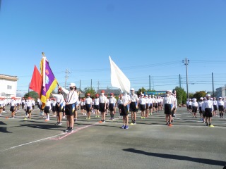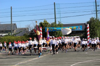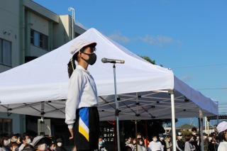 開会式では、児童会長のもつ校旗に先導されて、全校児童が元気よく行進しました。校長先生の話、PTA会長の林さんのあいさつ、児童会副会長の天川さんのことばのあと、赤白代表の宣誓が行われ、いよいよ運動会の幕開けです!