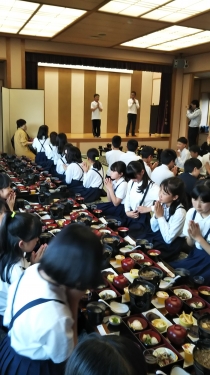 部屋で荷物を整え、6時から宴会場で夕食をいただきました。お膳に乗ったたくさんのごちそうを、美味しそうに食べていました。