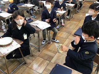 1年生は音楽の授業で、これまでにトライアングル、タンブリン、すず、カスタネットなどの打楽器の使い方を学習してきました。先日は、その中から一つ好きな楽器を選んだり、その楽器の好きな鳴らし方を考えたりしました。トライアングルでも、長く響かせる音が好きという子もいれば、棒を細かく動かして当てるときの音が好き、という子もいて、さまざまでした。ペアになって友達の演奏を聴く活動では、耳をすまして、「上手だね!」と声をかけあう姿が見られました。次回の合奏も楽しみです。