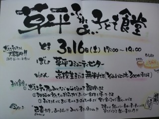 3月16日(土)に、今年度最後の「草平子ども食堂」があります。