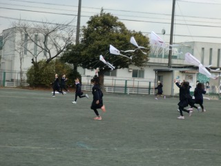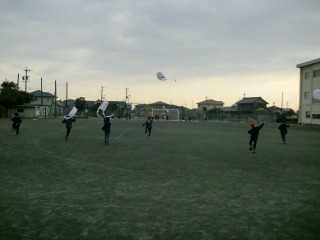 1年生は凧あげ初体験だった子も多く、運動場を東西に走ることで凧をあげました。移動で交差すると紐が絡まってしまうので、真っすぐに走るように指示されていました。自分は走っていくので、背中の向こうであがっている凧は見えません。「〇〇ちゃん、すごーい!」「〇〇君の凧、めっちゃあがっているね!」と声をかけられても自分では確認のしようがありません。でも、声をかけられてとても満足そうな顔をしていました。