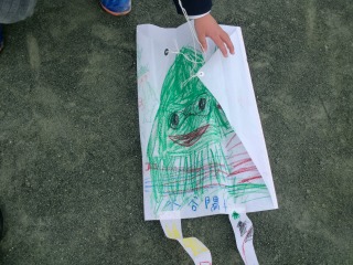 図工の時間に、凧に自分たちで絵を描き、組み立てて作りました。一人一人自分らしい絵が描かれた凧です。
