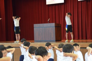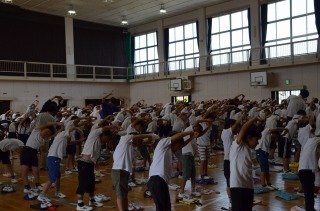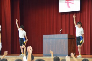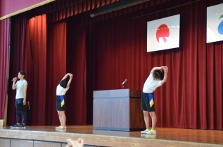 そして、今週から全校で本格的に体幹トレーニングに取り組みます。月曜日は、朝礼で体育委員会の子どもたちが手本になって行います。呼吸を意識しながら、体をのばしたりねじったり。足をもって反対の手を伸ばすと、体がぐらつく子もたくさんいました。体幹がしっかりしてくると、安定した姿勢でトレーニングができるようになりますから、頑張りたいですね。火曜日から金曜日は、毎朝読書のあとに放送に合わせて全校でトレーニングに取り組みます。