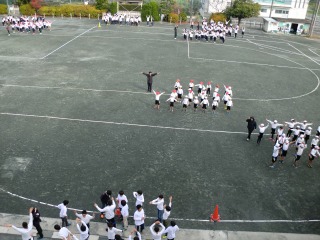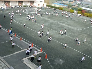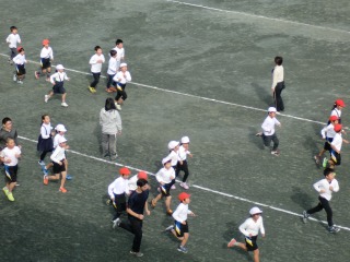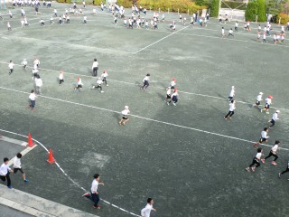 3階の廊下から運動場を見てみると、なかなか壮観な風景です。残念ながら自分自身に負けてしっかり走れない子も見られましたが、ほとんどの子どもたちは一生懸命に走っていました。持久走は心肺機能を高めるだけでなく、自分自身との戦いなので、精神的にも強くなれる種目です。つらいことにも乗り越えることができる気持ちが育ってくれるといいなあと思います。