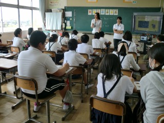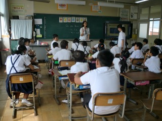 これだけの長い文章が流れるので、子どもたちはパニックになっていました。マイラ先生がゆっくり読み直しますが、一度パニックになった脳はすぐに戻らないようで、担任の小澤先生が一生懸命ヒントを出したりしていますが、全く耳に入っていかない様子でした。「classes」が学級数だと思い、「え~っ!8クラスもあるの?」「草平小学校は2クラスしかないのに!」と。小澤先生が、「前に習ったよ!思い出してごらん」と声をかけるも、長い英語の文章が流れたことへのパニックは収まらずでした。