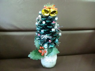 はじめにカップに紙粘土をしっかりと詰めます。その後、松ぼっくりの裏の穴に割りばしを刺しこみます。その割りばしの反対側を、紙粘土を詰めたカップにさすと、まるで本当のツリーのようになります。そして、やけどに気を付けながらグルーガンを使って、ビーズや鐘などの飾りを付けていきます。グルーガンのボンドが糸を引くので、それが気になって作業が止まってしまう子もいましたが、見本のツリーと見比べたりいろいろな角度から見たりしながら工夫して飾り付けていました。