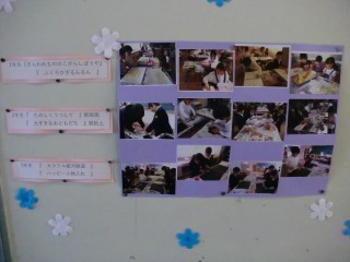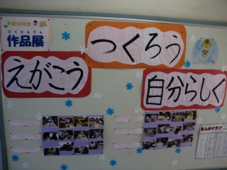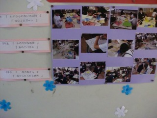今は、今月18日(金)・19日(土)に開催される、作品展に向けての掲示が貼られています。今年度は、『えがこう つくろう 自分らしく』というテーマで開催します。18日(金)は、1~6限を使って、全校児童が作品の鑑賞行います。19日(土)の9:00~12:00には、保護者や地域の方の鑑賞が予定されています。テーマの下の方には、各学年の作品制作への取組の様子が写真で掲示されています。ほとんどの学年は作品をほぼ完成させ、今は作品の名札づくり、レイアウトやタイトル、飾りなどの詰めの段階に入っています。いろいろ工夫を凝らし、作品を置いたり掲示したりするだけでなく、楽しく見てもらえるように取り組んでいます。