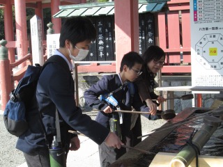 やっと目的地の津島神社に到着し、手を清め、まずはお参りをしました。わたしも草平小学校の6年生が無事に卒業し、充実した中学校生活が送れるように。また新しい1年生を迎えて草平小学校の子どもたちが、ますます健康で勉強に運動に取り組めるようお願いをしました。