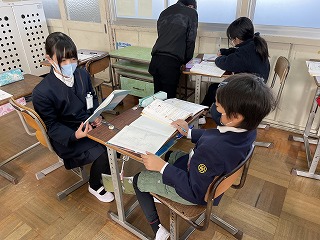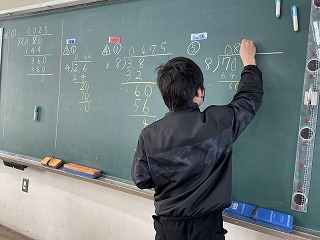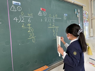 4年生は算数の授業で「小数のかけ算やわり算」の学習をしています。割り切れる割り算の学習では、整数と同じように計算することができましたが、割り切れない場合や割り進む場合の学習になると、思うように問題を解けない様子が見られてきました。そのような場面で、早く問題を解き終えた子はミニ先生になり、困っている友達を助ける姿が見られました。クラスの皆で一生懸命に練習問題に取り組むことができました。
