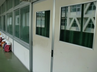 教頭先生にも応援してもらって視聴覚室に移動し、DVDを鑑賞しました。本編の前のお知らせが長く、「まだ~?」という声も聴かれましたが、本編が始まると静かに集中して観ていました。廊下には、すぐその場で解散できるようランドセルが並んでいて、暗幕の引かれた窓の向こうで、DVDの音声が響いていました。