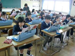校内を歩いていると、音楽室から鍵盤ハーモニカの音色が聞こえてきました。引き寄せられるようにして中を覗iいてみると・・・・。1年2組の子どもたちが、一生懸命に鍵盤ハーモニカを演奏していました。
