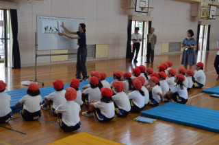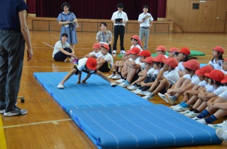 4時間目は研究授業で、3年1組の体育の授業を全職員も参観しました。子どもたちは楽しそうにマット運動に取り組み、技能を身に付けていました。今日の課題の技の開脚前転は、脚を伸ばして行うことがなかなか難しく、タカアシガニのようになっている子もいました。