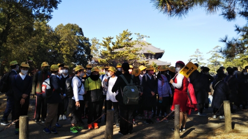 バスに一時間程揺られて、東大寺に到着しました。今から記念撮影をします。その後みんなで東大寺を見学し、班ごとで奈良公園内を見学します。
