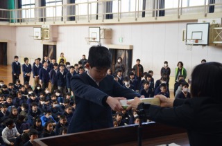 今日の朝礼では、はじめに『山内賞』の授与式を行いました。