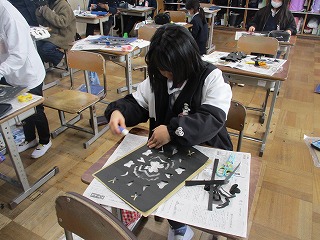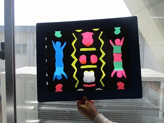 黒い色画用紙を2回折り、はさみでいろいろな形を切り抜き、そこにカラーセロファンを貼っていきました。できた作品を窓から光を通すと、とてもきれいに見えました。