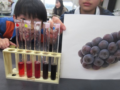 ムラサキキャベツを少し煮立たせてこしだした液を作ります。今回は、さらに、紫に関係のある植物・食品を各班で選んで作ってみました。今回選んだものは、「ぶどう」「ブルーベリー」「クランベリー」「しそ」「パンジー」「なす」です。楽しく追究できたようです。実際にやってみる!という経験が大切ですね。