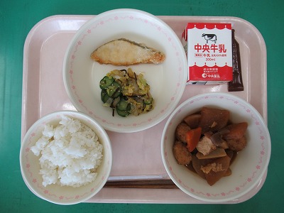 本日の献立:ごはん・牛乳+ココア牛乳の素・ほきの甘酢・ミートボール入り味噌おでん・昆布和え
