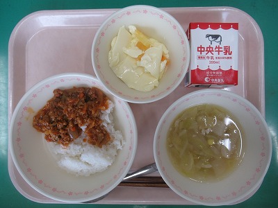 本日の献立:キムタク丼・牛乳・さつまいもスティック・ちゃんこ汁