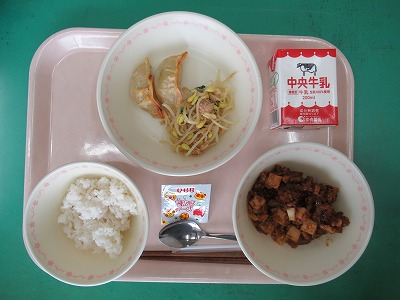 本日の献立:麦ごはん・牛乳・ぎょうざ・麻婆豆腐・大豆もやしのかみかみ和え・型抜きチーズ