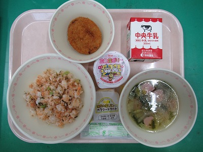 本日の献立:ごはん・牛乳・さけちらしごはん・コロッケ・梅のすまし汁・セレクトデザート☆