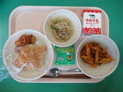 本日の献立:クロワッサン・牛乳・ペンネマカロニのミートソース・れんこんチップス・大根サラダ・乾燥豆腐