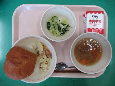 本日の献立:りんごパン・牛乳・じゃがいもチーズ焼き・グリーンサラダ・コンソメスープ