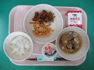 本日の献立:ごはん・牛乳・鶏ごぼう・にんじんのツナたま炒め・具だくさん汁・ももゼリー