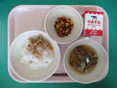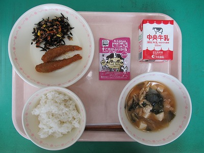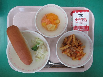 本日の献立:ツイストロールパン・牛乳・焼きそば・フランクフルトケチャップソース付・とうもろこしともやしのサラダ