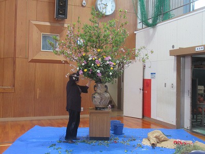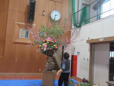 入学式に向けて、地域の華道の先生に来ていただき、入学式の鉢に生け花をしていただきました。とっても素敵で会場がぐっと華やかになりました。ありがとうございました。明日の入学式が楽しみです。