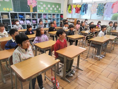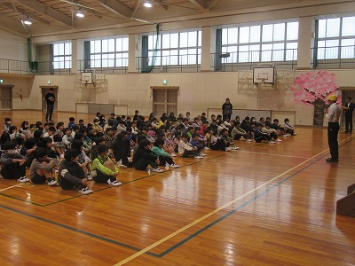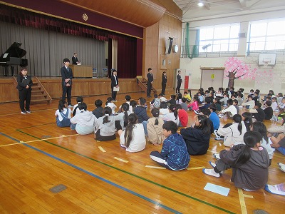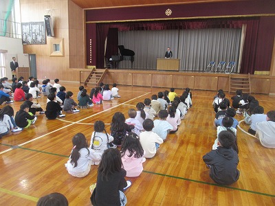 校長先生からのお話の後、担任の先生の発表がありました。新しい気持ちで今年度をスタートしていく意気込みを子どもたちの表情から感じ取れました。また、校歌をすばらしい歌声で1年生に披露することができました。明日からも元気いっぱいに学校生活をすごしていきましょう。