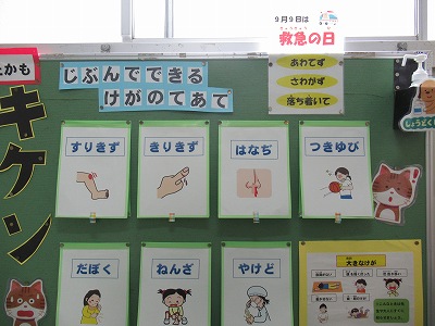 9月の保健目標は「じょうぶなからだをつくろう」です。運動してからだをきたえたえたり、バランスよく食べ物を食べたり、しっかり眠ったりして、「じょうぶなからだ」を作ることが大切です。それとともに、「けが」をせず生活することも大切です。また、「けが」をしたとき、自分でできる「てあて」をおぼえて、できるようにすることも「生きていくうえで」重要です。