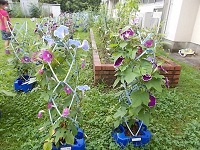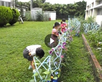 映像は、アサガオのつるの先の芽を切っている子どもたちの様子です。アサガオにとっては、少しかわいそうな気持ちになりますが、そうすることで、まだ芽を出していなかった本葉の付け根からわき芽と呼ばれる新しい芽が育ち始め、わき芽を増やすことでボリューム感を出すことができるそうです。